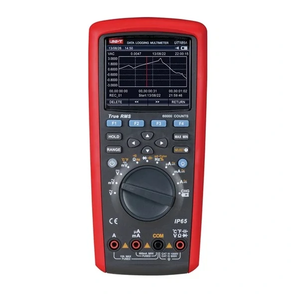 Multimetr UNI-T UT181A je inteligentní ruční multimetr s automatickým nebo ručním přepínáním rozsahů, který měří hodnoty efektivní ( RMS ), maximální, minimální nebo průměrné. Přístroj se řadí do vyšší třídy, vyniká kvalitním provedením a spolehlivostí a je vhodný i pro průmyslové použití. Voděodolnost a prachuvzdornost je v kategorii IP65. Displej je typu podsvícený grafický LCD, s maximálním rozlišením 4 5/6 digitů, maximální zobrazená hodnota je ±60000. Multimetr umožňuje měření AC/DC napětí a proudů, odporu, test diod, test spojitosti, měření kapacity, frekvence, střídy, teploty, vodivosti, porovnávací měření, měření relativních hodnot, detekce špiček a záznam dat v počtu až 20000 údajů. Přístroj umožňují ukládání dat do PC pomocí připojení přes adaptér USB s optickým oddělením, nebo pomocí Bluetooth. Součástí displeje je analogový ukazatel - bargraf s 61dílky. Multimetr obsahuje interní hodiny, které zobrazují čas a datum, které je možné automaticky přiřadit uloženým vzorků naměřených hodnot v intervalu 1sec až 1 hod, včetně doby po kterou se má ukládat (až dny). Možnost zařazení dolnopropustného filtru pro měření na střídačích a generátorech. Možnost dvoukanálového měření teplot. Jištění proudových rozsahů je provedeno trubičkovými tavnými pojistkami (rozsah 10A pojistkou FF 10A H/1000V (10 x 38mm); rozsah mA/µA pojistkou FF 800mA H/600V (6 x 32mm)). Přístroj umí testovat své vlastní pojistky (bez otevření přístroje). Napájení multimetru je provedeno lithiovým akumulátorem 7,4V/2000mAh. Součástí balení jsou měřící kabely s hroty v bezpečnostní kategorii CAT III 1000V a CAT IV 600V.